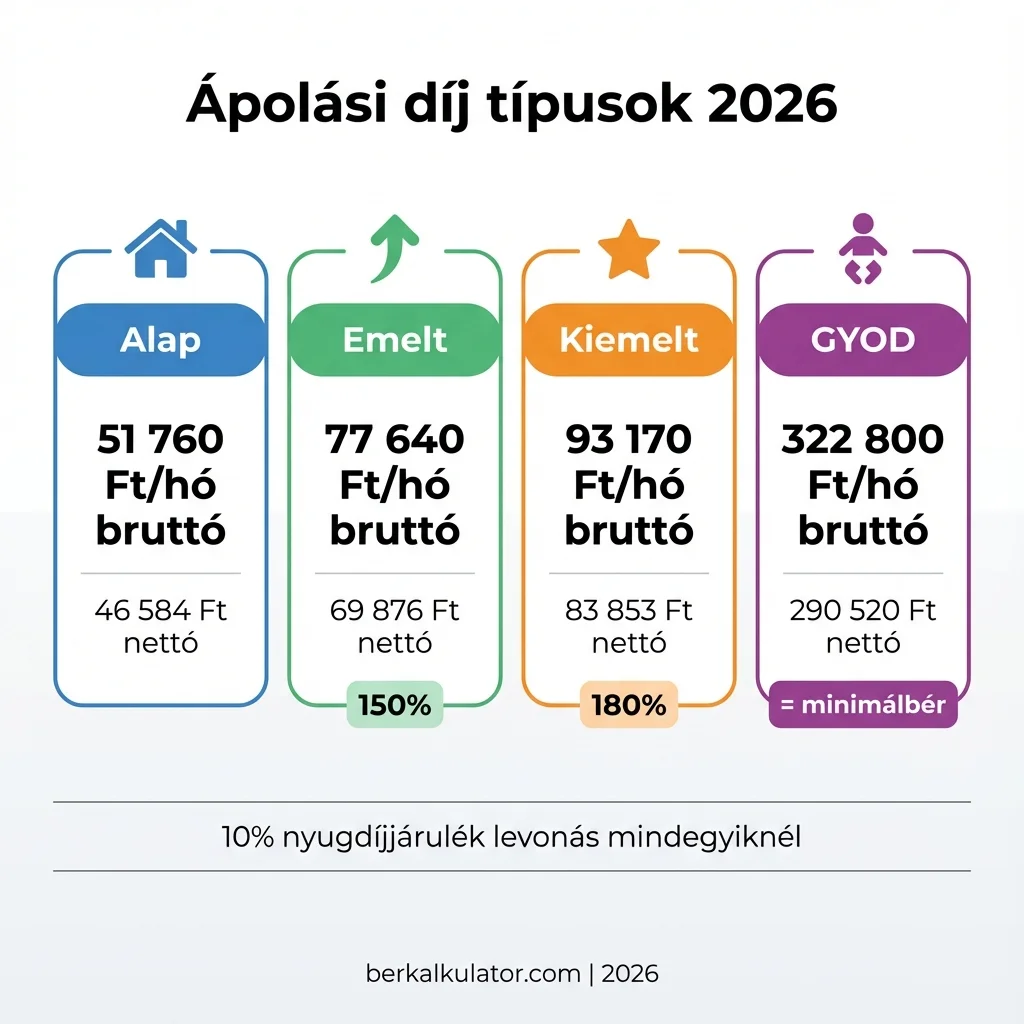 - Alap ápolási díj 2026: bruttó 51 760 Ft/hó (nettó 46 584 Ft)
