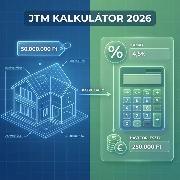 Mi az a JTM és hogyan számítják? A JTM (jövedelemarányos törlesztőrészlet mutató) az MNB szabálya, ami korlátozza, hogy a nettó jövedelmed mekkora részét fordíthatod hiteltörlesztésre. 2026-ban 800 000 Ft havi jövedelem alatt 50%, felette 60% a limit 10+ éves jelzáloghiteleknél.