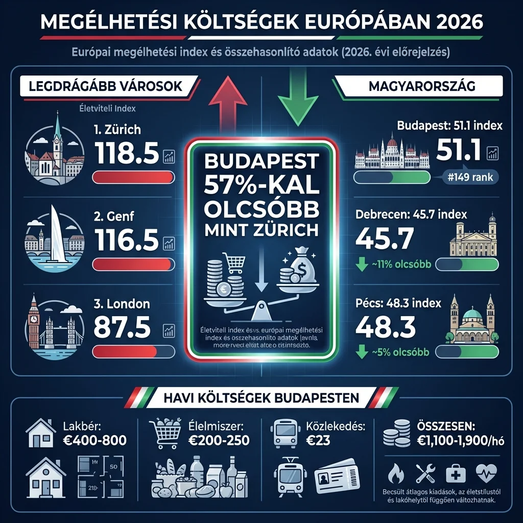 Budapest havi €1,500 körüli költséggel európai minőségű életet biztosít. Ez 57%-kal olcsóbb, mint Zürich (Numbeo 2026 COL index alapján).