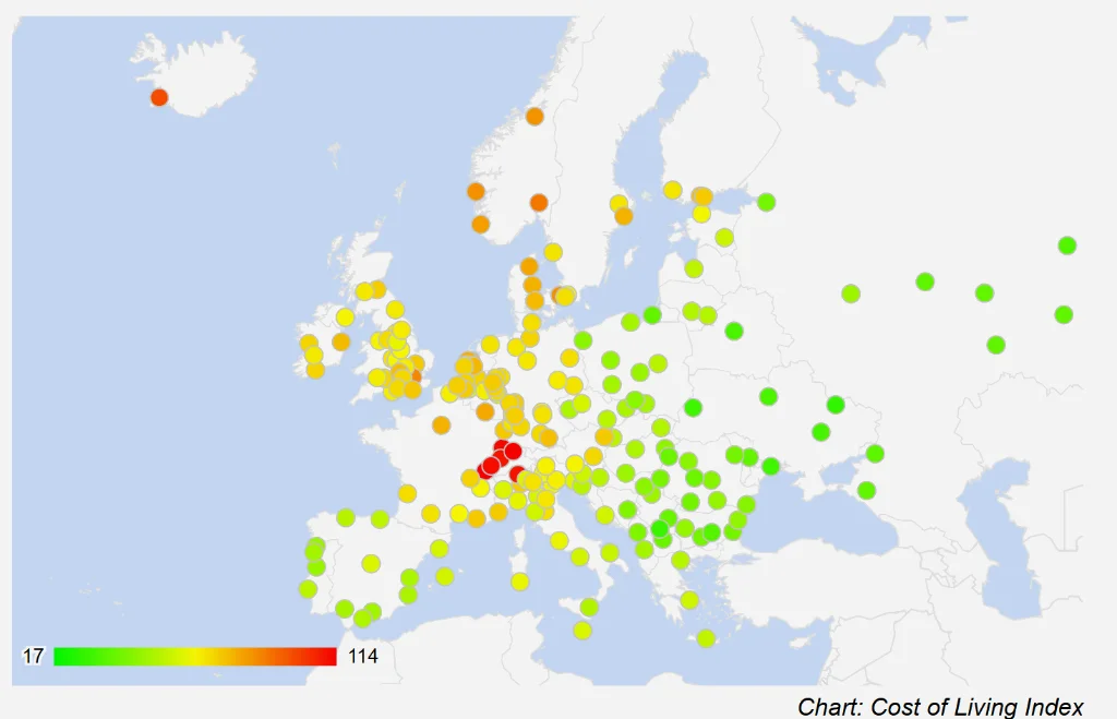 Európa városainak megélhetési költség indexe 2026-ban. Zöld = olcsó, Piros = drága.