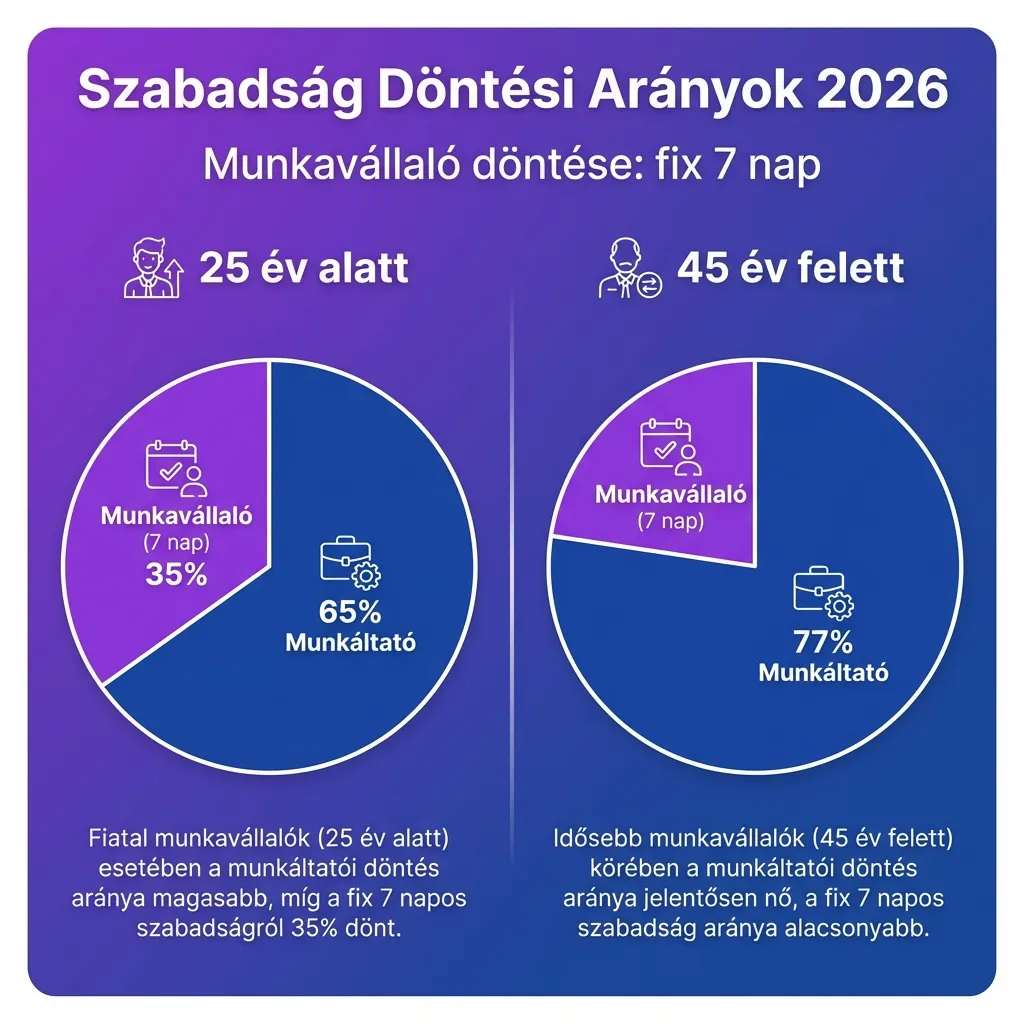 A munkavállaló 2026-ban is fix 7 napról rendelkezhet, de az életkori pótszabadság növekedésével ez az arány 35%-ról 23,33%-ra csökken. Gyermekes szülőknek a pótszabadság extra döntési jogot ad.