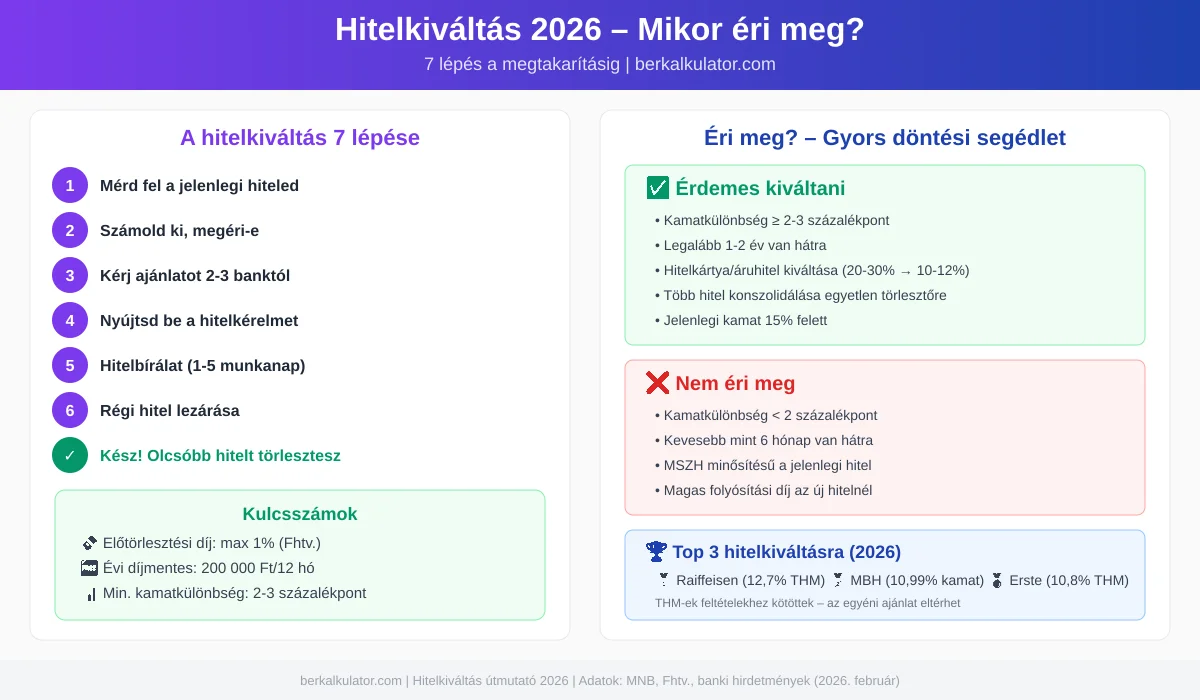 - 🏦 Legjobb ajánlatok 2026-ban: Raiffeisen Hitelkiváltó Plusz (11,99% kamat), MBH Kamatvágó (10,99%-tól), Erste (10,8% THM-től)